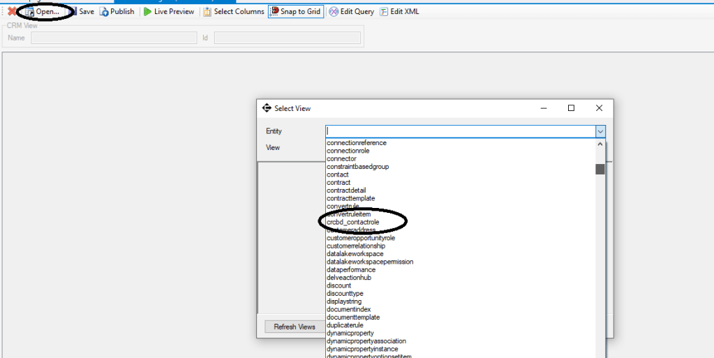 Open the plugin in the XrmToolbox, click on the Open button, this will list all the entities in the dropdown as shown below. Choose the entity in the entity dropdown, then pick the view that you need to customize in the view dropdown.