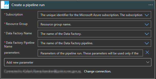 The connector needs, Subscription, Resource Group, Data Factory Name and Data Factory Pipeline values as mandatory. The parameters is the optional input. By making use of it we can able to pass parameters to Pipeline.