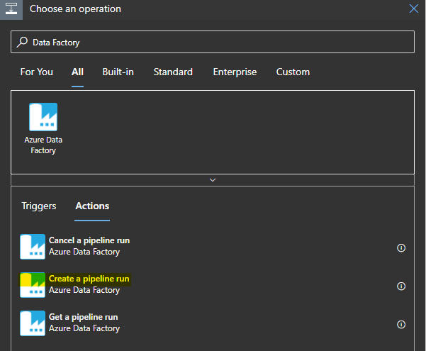 In order to trigger a Data Factory Pipeline, LogicApps got an out of box connector shown below. This will help trigger a pipeline that is configured in the Data Factory.