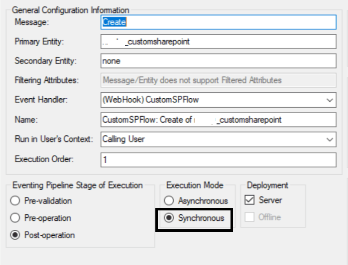 Once the flow is ready, register the flow URL as a web hook in the plugin registration tool as below. Copy only the base URL in the Endpoint URL (https://{instance_domin}:443/workflows/c345asdasdada4dda84535da53454312b65/triggers/manual/paths/invoke).