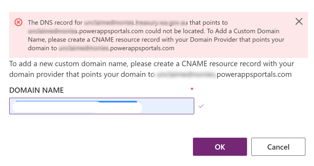 There are sometimes you might see this below message saying “To add a new custom domain name, please create a CNAME resource record with your domain provider that points your domain to xxx.powerappsportals.com”