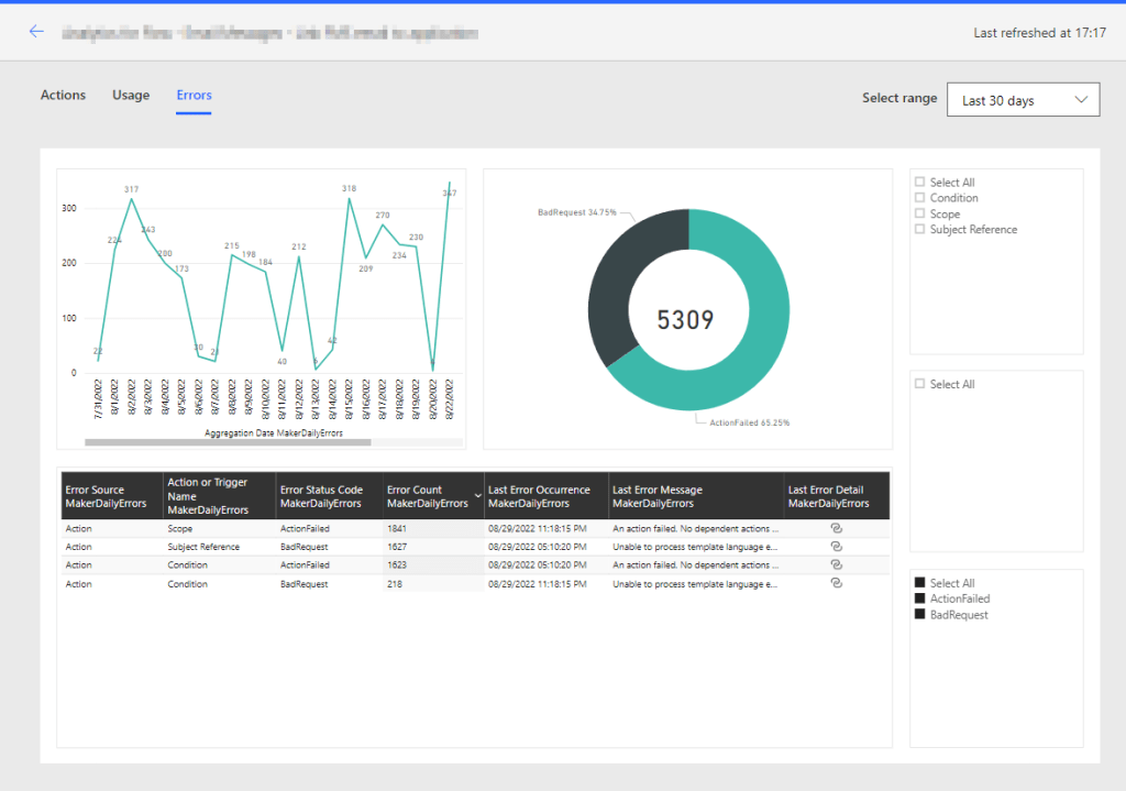 The Analytics will be shown something like below. Good thing about this data is that it will tell even deeper information on the which steps got more error and what is the error message it is getting. Practicality is the issue here, we can’t simply go in to each and individual flows to monitor every day.