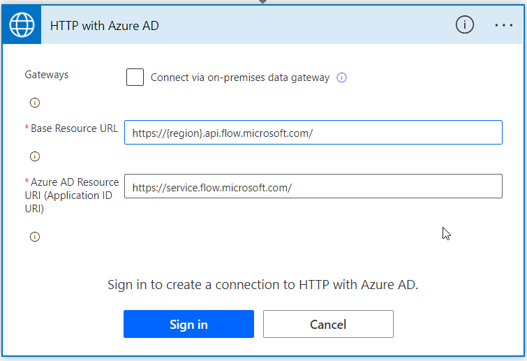 To establish the connection, utilize the following connection information. Replace the “{region}” placeholder with the corresponding region for your environment (e.g., “https://australia.api.flow.microsoft.com/“).