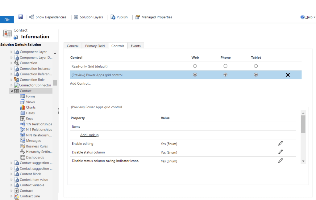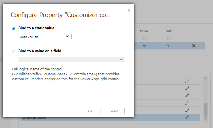 The Customizer control property is also available to link to a single customizer PCF control with definitions for changing the visuals or interactions for one or more columns in the grid.