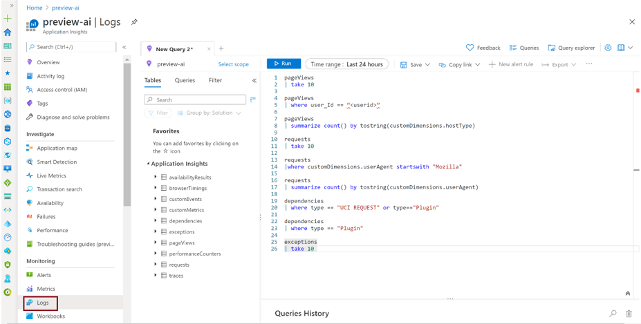 Zoe: You can query the data using the Logs panel under Monitoring in Application Insights. Common fields include cloud_RoleInstance, operation_Id, session_Id, and user_Id. You can write queries in Kusto Query Language (KQL) to analyze the telemetry data.