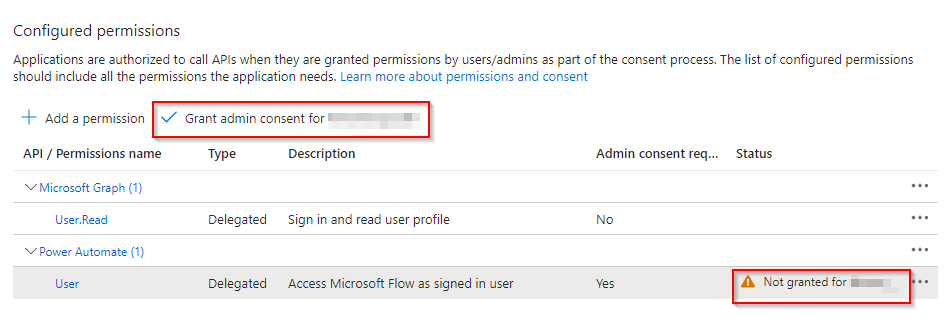 - Under ‘API permissions’, add necessary permissions for Microsoft Power Automate API. Ensure to get admin consent for these permissions.