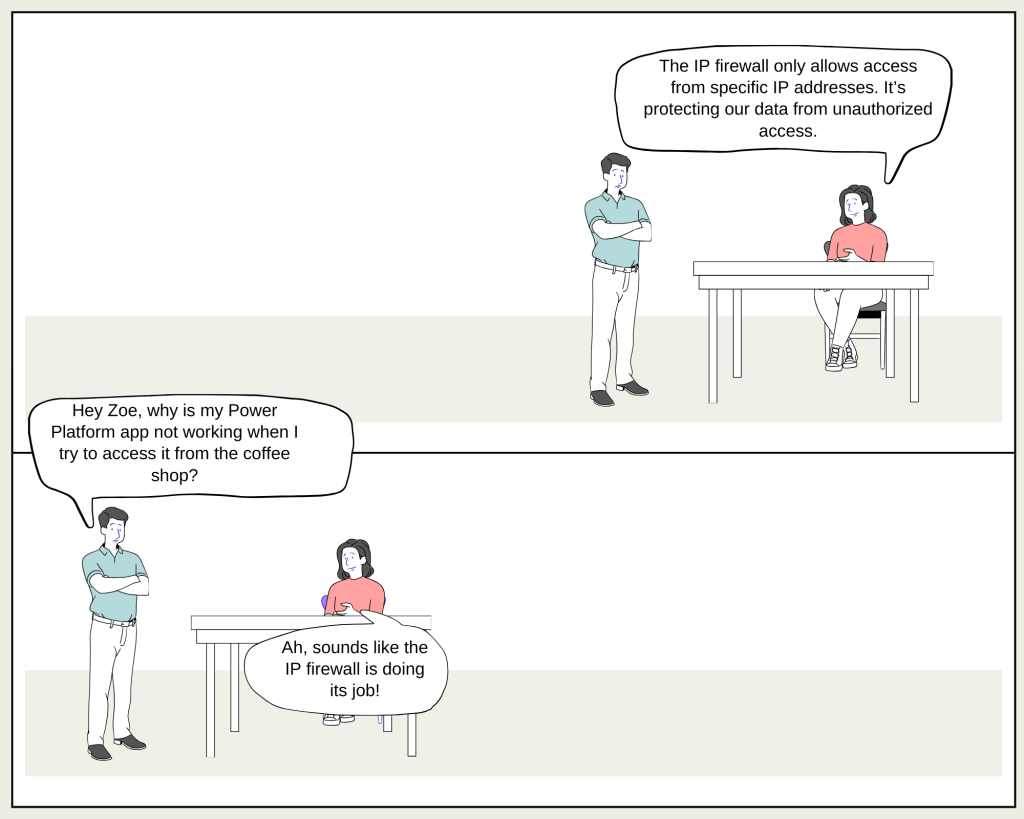Zoe: “Ah, that’s the IP firewall in action! It’s a security feature that helps protect our organizational data by limiting access to Microsoft Dataverse from only allowed IP addresses. Since you were at a coffee shop and not at one of our approved office locations, the firewall blocked your access.”