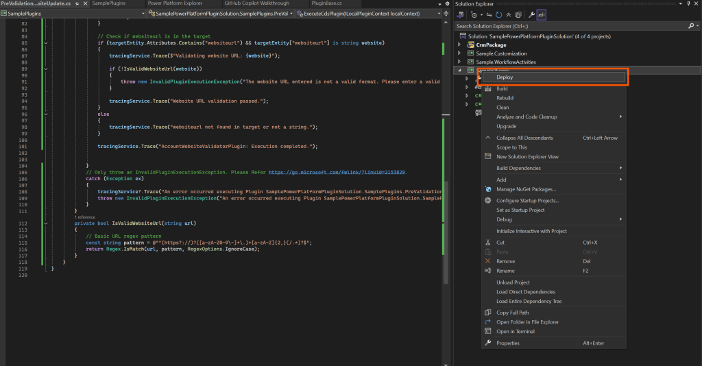 5. Use the Deploy option to deploy the package. This will auto-register the plugin and DLL.