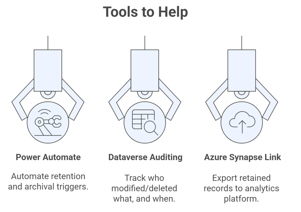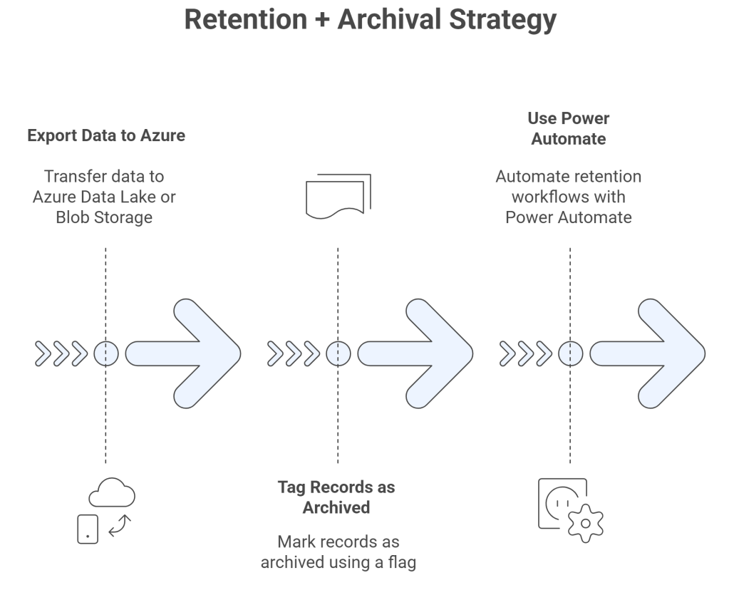 Example: A custom plugin detects records older than 5 years, checks if isRetained is true, and instead of deleting, moves them to long-term storage.